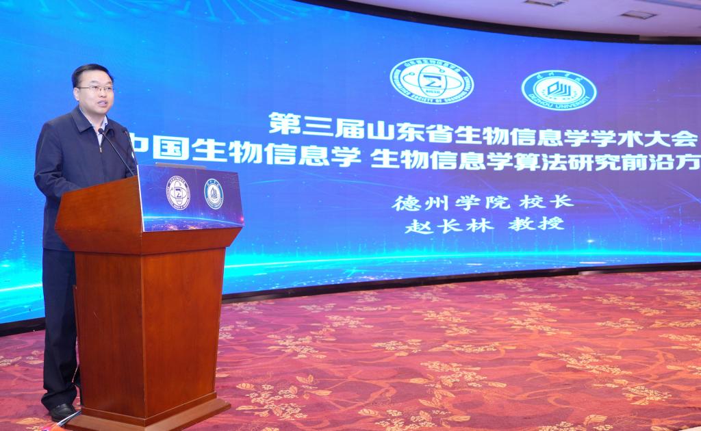 赵长林在致辞中向与会专家和嘉宾的到来致以热烈欢迎和诚挚地感谢,介绍了德州学院取得的办学成绩,分享了生物信息学的学科魅力和应用前景,他说,承办本次大会倍感荣幸,相信通过这场学术盛宴中思想碰撞、学术成果共享,产出更多原创性、引领性的学术研究成果,为国家科技自立自强作出应有贡献。学校将在全力做好会务服务的同时,加强与国内外高校、科研院所、行业企业专家学者学术交流合作,加快推动学校生物信息学学科专业高质量发展、特色发展。