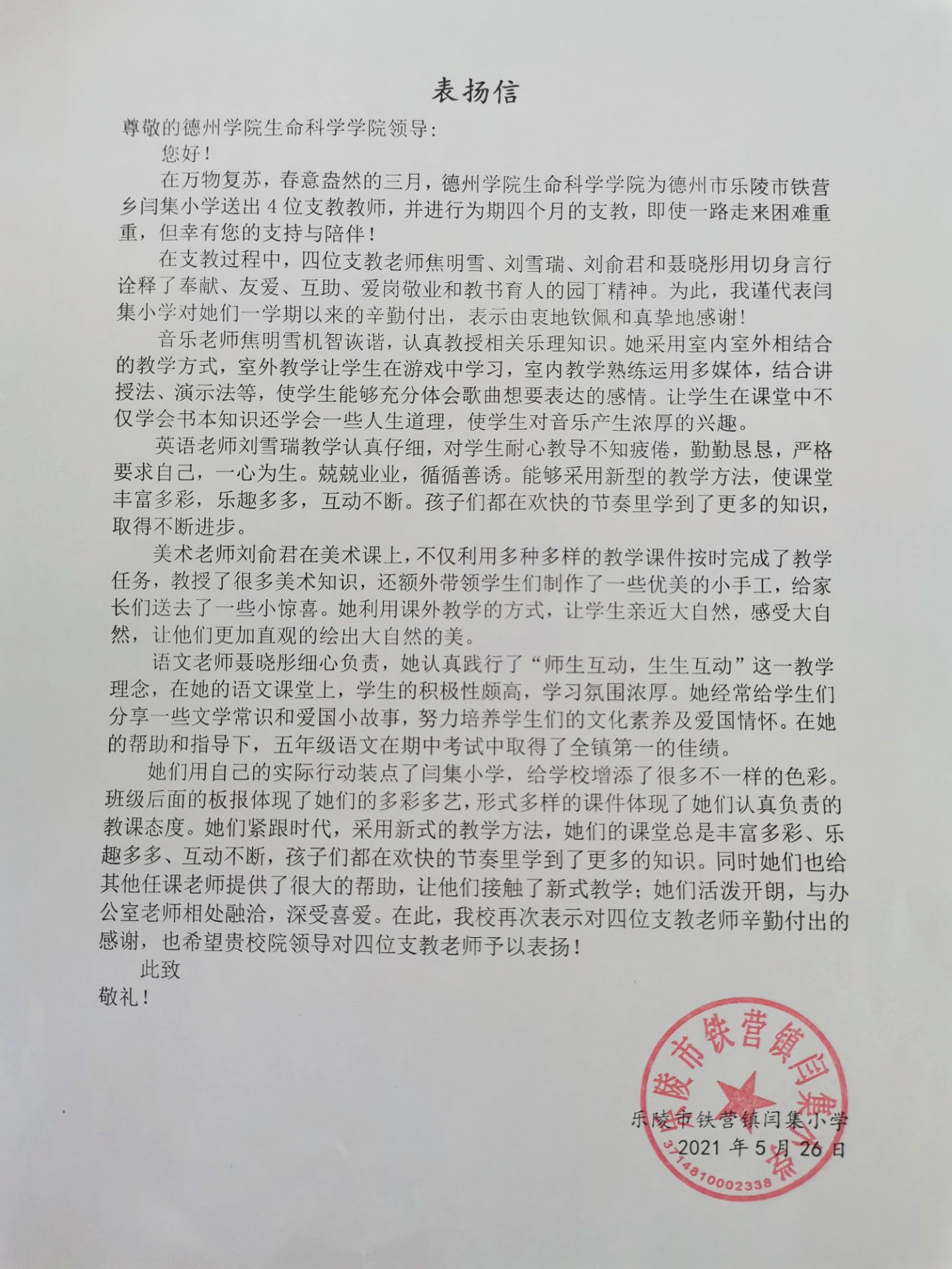 2021年6月3日,精品视频8AV2018级生物科学本科班焦明雪、刘雪瑞、刘俞君和聂晓彤四位同学因在支教期间表现突出,受到了支教学校乐陵市铁营镇闫集小学的表扬。