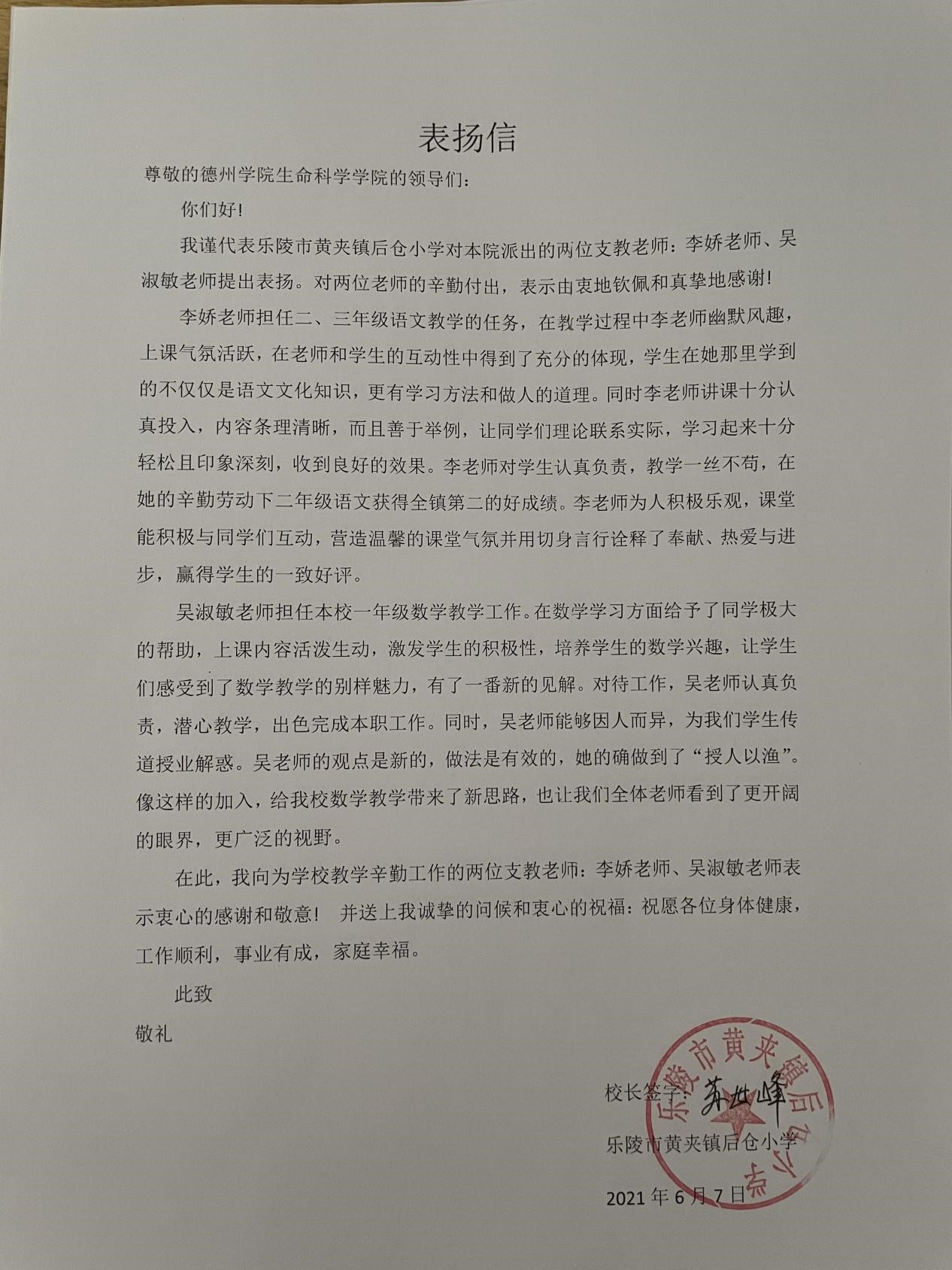 2021年6月7日,精品视频8AV2018级生物科学本科班李娇、吴淑敏两位同学因在支教期间表现优异,得到支教学校的认可,受到乐陵市黄夹镇后仓小学校领导高度赞扬。
