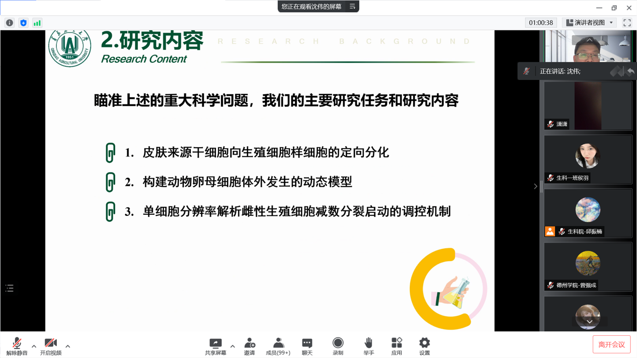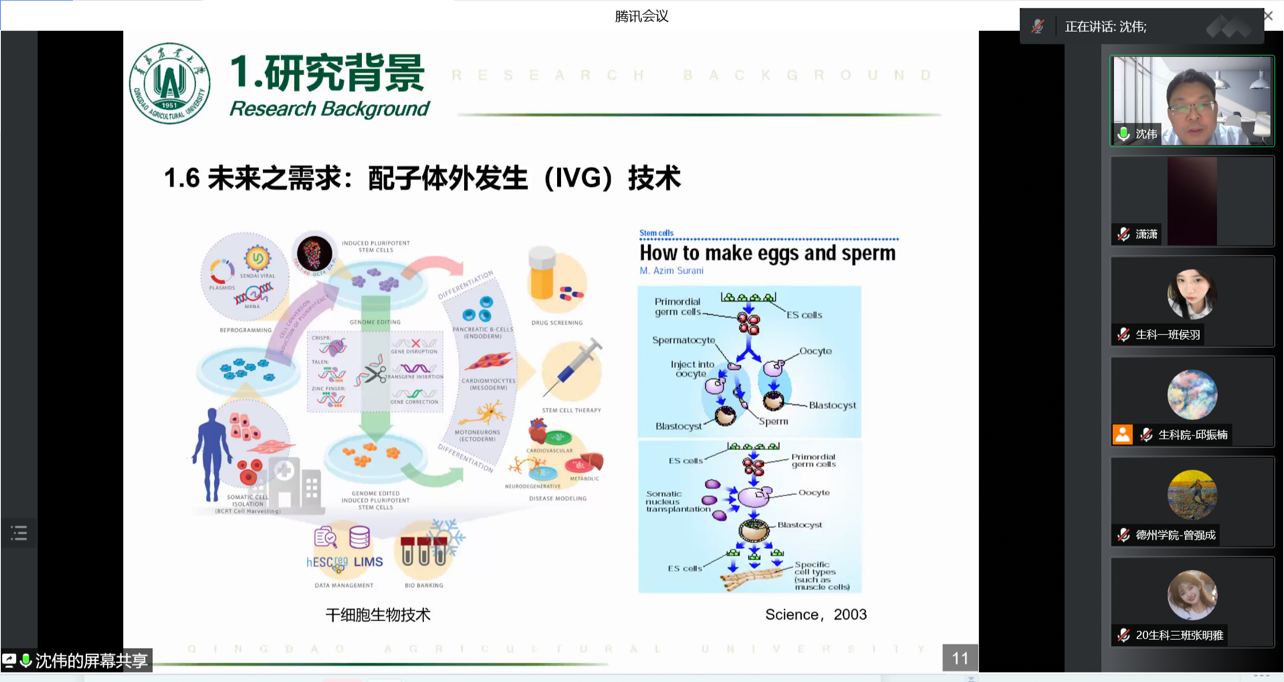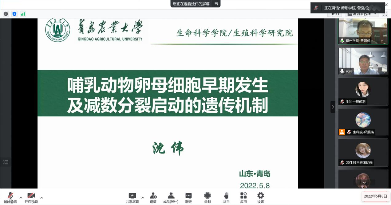 2022年5月8日,精品视频8AV、现代生物技术产业学院、生物物理研究院、科研处通过腾讯会议联合开展了德州学院51周年校庆学术讲坛—哺乳动物卵母细胞早期发生及减数分裂启动的遗传机制。青岛农业大学精品视频8AV院长沈伟为大家作了专题学术报告,我院院长、专业课老师及20级部分学生参加了此次活动。