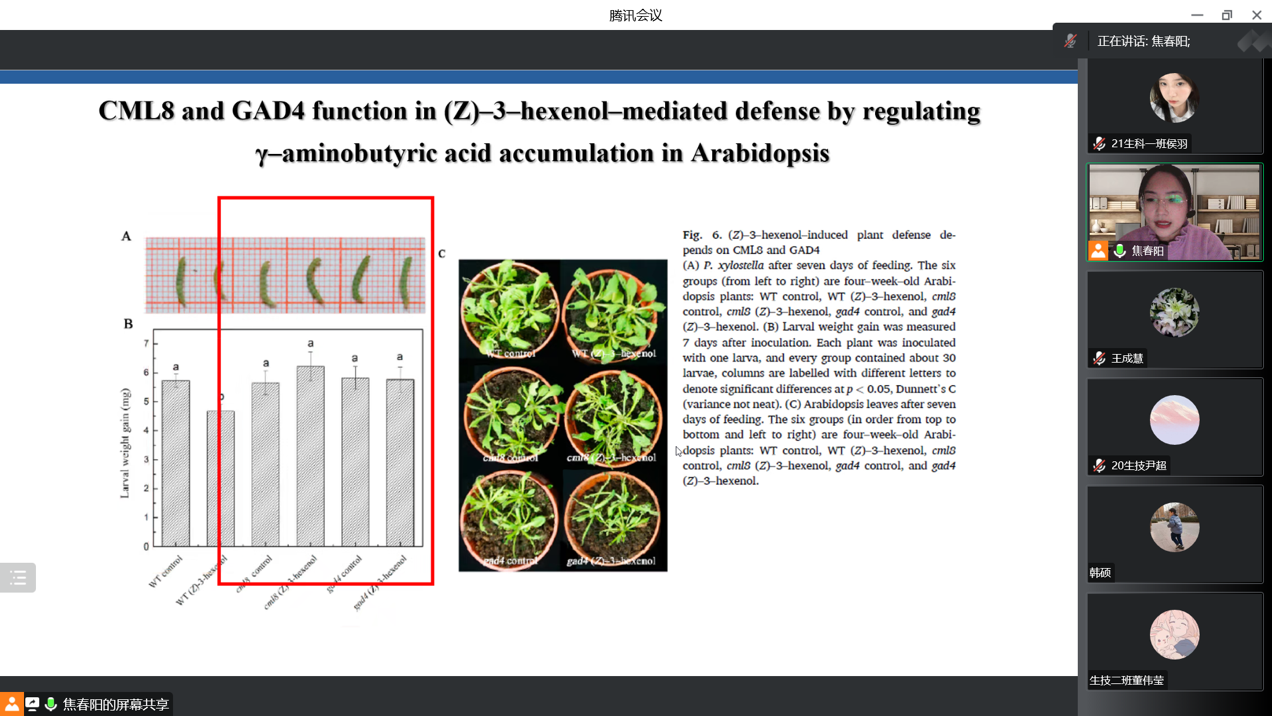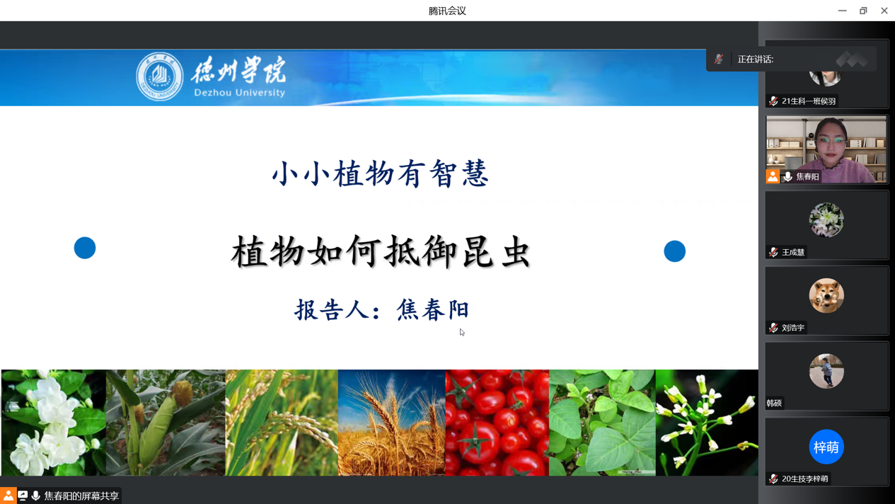 为激发同学们的科研兴趣,增强学科素养,精品视频8AV通过腾讯会议举办线上“小小植物有智慧—植物如何抗虫”专业前沿知识讲座。
