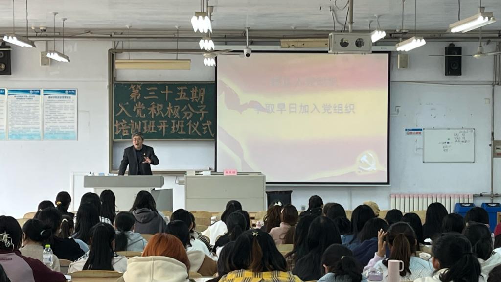 会议伊始,王琦老师向全体学员介绍了本期培训的课程设置和学时安排,对培训的组织纪律作着重强调。开班仪式结束后,党委书记赵庆福同志为各位学员作“端正入党动机,争取早日加入党组织”主题讲座,他强调全体学员要端正入党动机,认真学习党的理论知识,努力提高为人民服务的本领。随后,赵书记表示全体学员要以党员的标准严格要求自己,坚定共产主义信念,自觉接受党的考验,尽早的成为一个立场坚定、忠诚于党的事业的先锋战士。最后,赵书记希望全体学员珍惜难得的学习机会,把习近平新时代中国特色社会主义思想转化为坚定理想、锤炼党性、指导实践、推动学习的强大力量,以实际行动争取早日加入中国共产党。