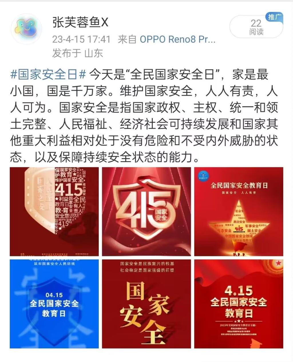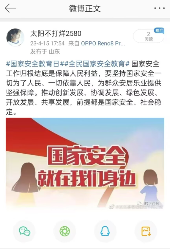 4月15日,为牢固树立总体国家安全观,推动国家安全教育工作广泛深入普及,增强同学们维护国家安全责任意识,精品视频8AV开展“微博#国家安全日#话题”互动活动。