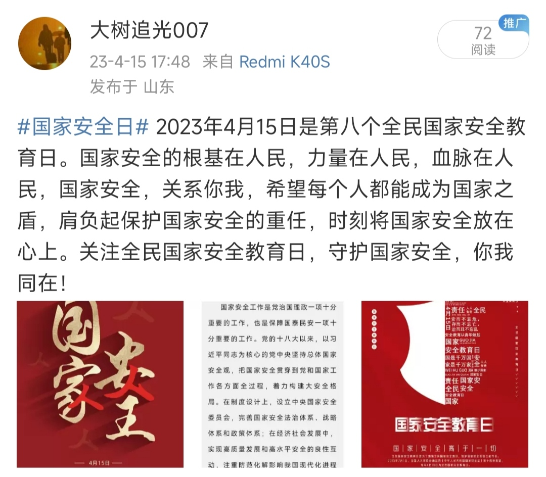 活动中,同学们积极响应号召,在微博通过“#国家安全日#”话题标签参与互动,用文字和图片表达自己对国家安全相关知识的认识和对国家安全教育日理念的理解,用实际行动维护国家安全、践行维护国家安全义务,同学们纷纷表示维护国家安全是国民生存发展的基石,更是青年的时代担当。