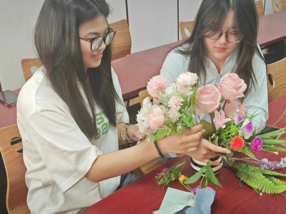 活动中,主讲人首先向大家介绍了插花的起源、发展及其在中国传统文化中的重要地位,使同学们对插花艺术有了更深入的了解。同时,她详细讲解了插花的基本技巧和方法,并通过现场演示,让同学们更加直观地了解了插花的实际操作过程。随后,同学们选取了自己心仪的花卉,结合插花技巧提示,相互讨论插花工艺、插花形式及色调搭配。各式各样的鲜花经过同学们的修剪、组合和自我创造,成为了一件件错落有致、富有创意的艺术品。