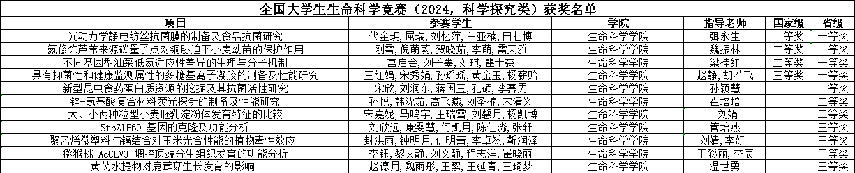 近日,2024年全国大学生生命科学竞赛(科学探究类、创新创业类)圆满落下帷幕。据悉,全国大学生生命科学竞赛(2024,创新创业类)和全国大学生生命科学竞赛(2024,科学探究类)分别在聊城大学和山东理工大学举行,我院共有15个项目荣获国家级或省级奖励,其中国家级二等奖3项、三等奖1项,省级一等奖4项、二等奖3项、三等奖8项的优异成绩。