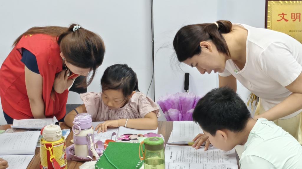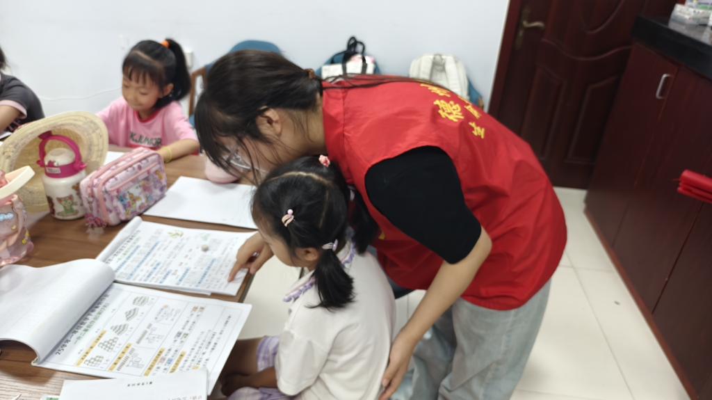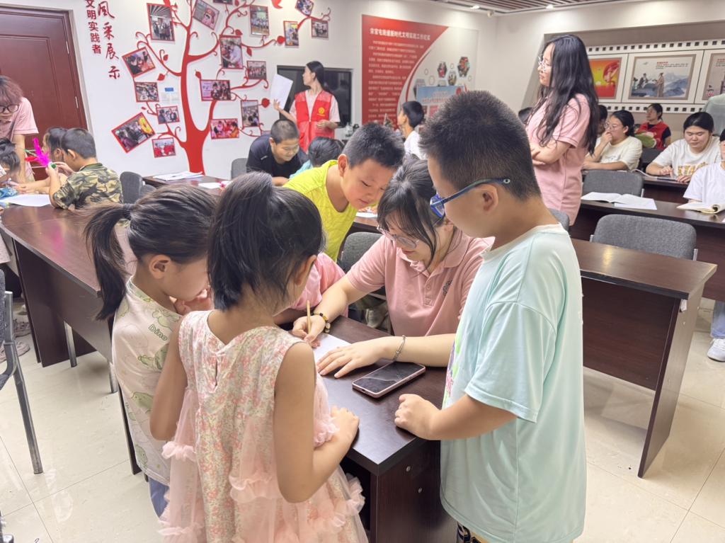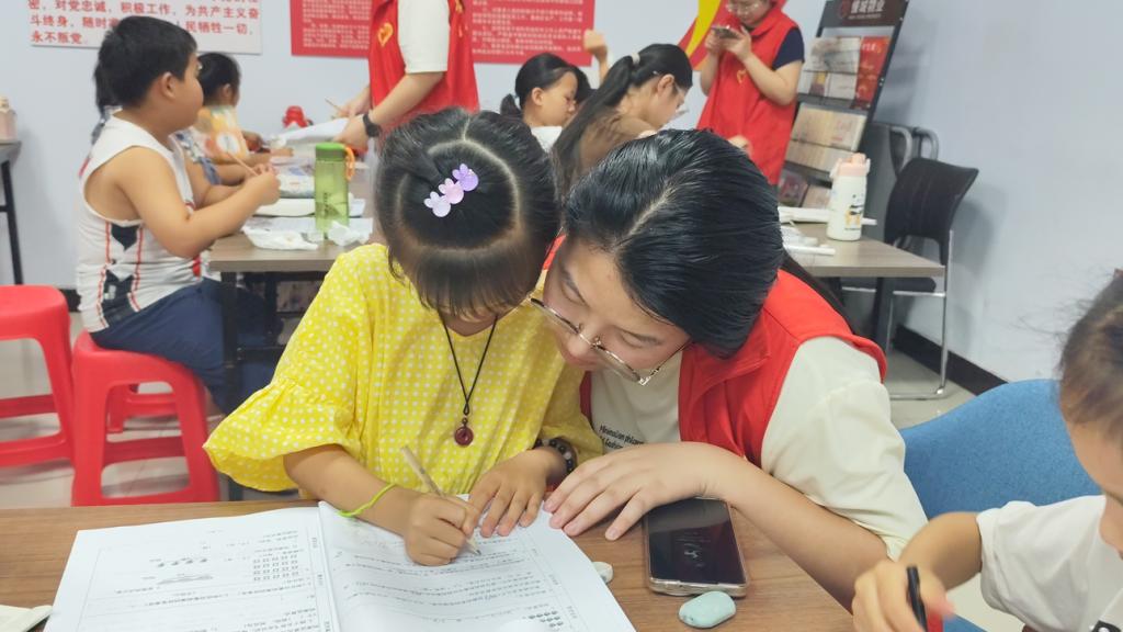 针对假期作业辅导的实际需求,志愿者们建立常态化陪伴机制,为不同年级儿童提供针对性帮助。数学题像只小怪兽?别急,志愿者们拿笔做“武器”,一步步带领孩子们拆招,明晰解题思路;拼音书写不规范?志愿者大手握小手,一笔一划把拼音“归位”,让字变得精神抖擞;作文犯了“小迷糊”?没关系,与志愿者们一起聊聊蓝天草地,甚至是动画片里的超级英雄,学会发散思维,灵感就源源不断……这份常态化的辅导,像一缕温暖的阳光,不仅帮孩子们解决了学习困惑,更让他们感受到持续的关怀与陪伴。