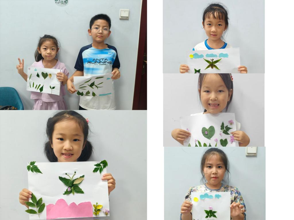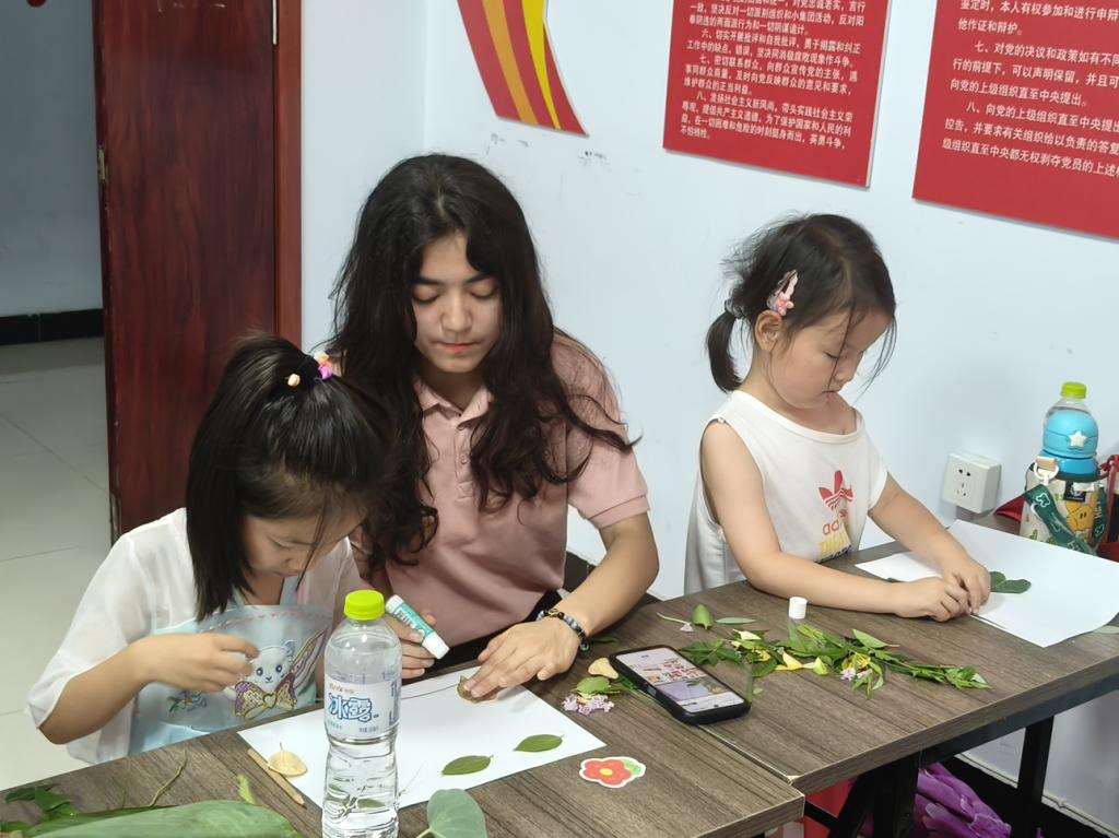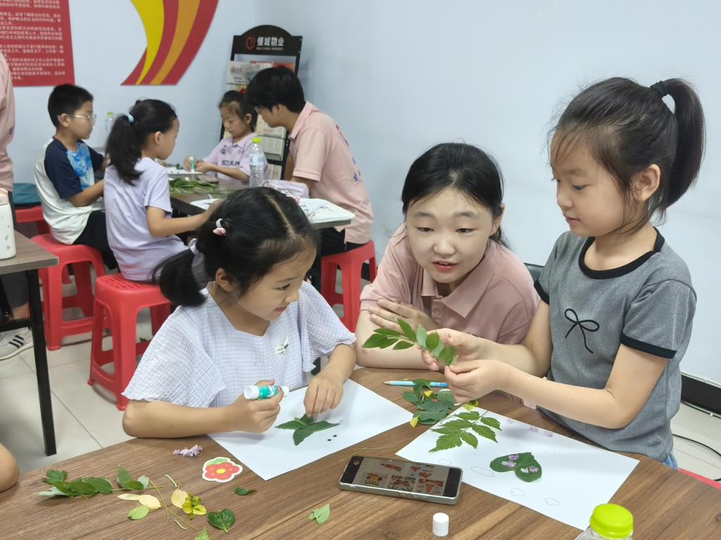 (志愿者和孩子们一同制作树叶粘贴画)