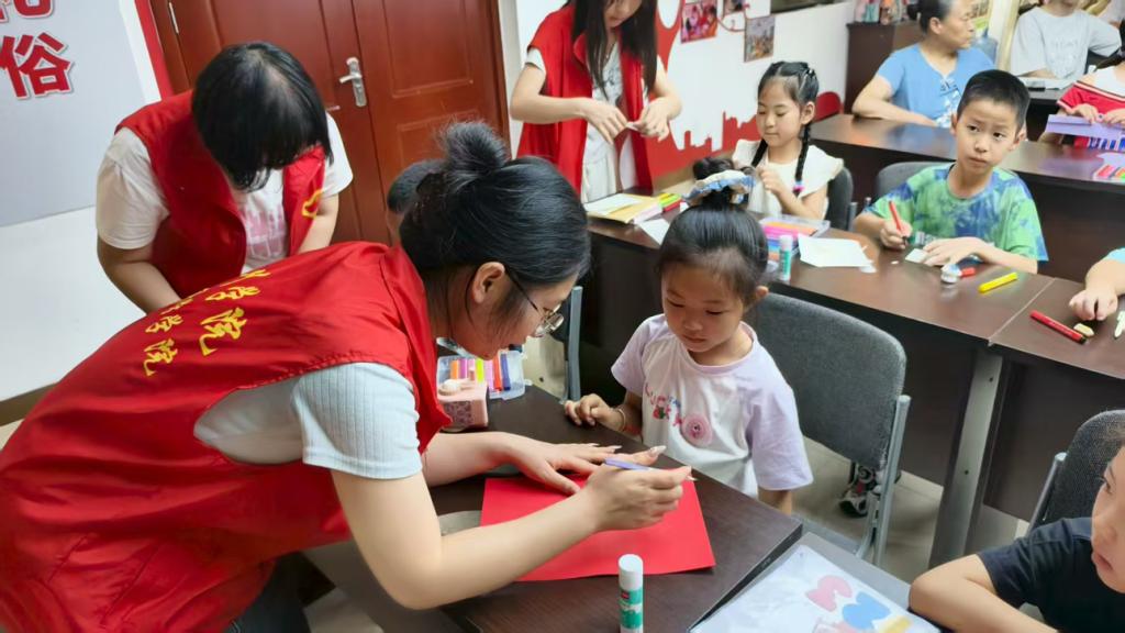 服务队将红色教育融入实践体验,以生动形式传递精神力量。红色书签制作课上,志愿者将长征故事、雷锋叔叔的事迹变成创作灵感,孩子们拿着彩笔、卡纸,一笔一划写下“我爱祖国”,红颜料沾到指尖,却把红色记忆牢牢印在心里;江南水郡社区的“红色美育”活动中,志愿者带领儿童学唱《少年中国说》并编排手势舞,在歌声里跳出“少年担当”,小手一挥,眼神里全是“我要当小英雄”的劲儿;红色故事分享会上,听着听着,孩子们渐渐懂了“为什么要传承”。志愿者讲的雷锋助人、红军长征,成了孩子们眼里会发光的“星星”。红色基因就这样“活”了过来,变成他们能明白、也能学着做的小事。