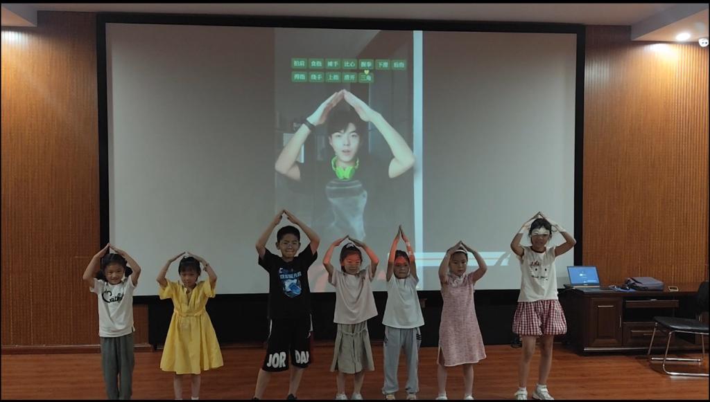 (孩子们学唱《少年中国说》、学跳手势舞)