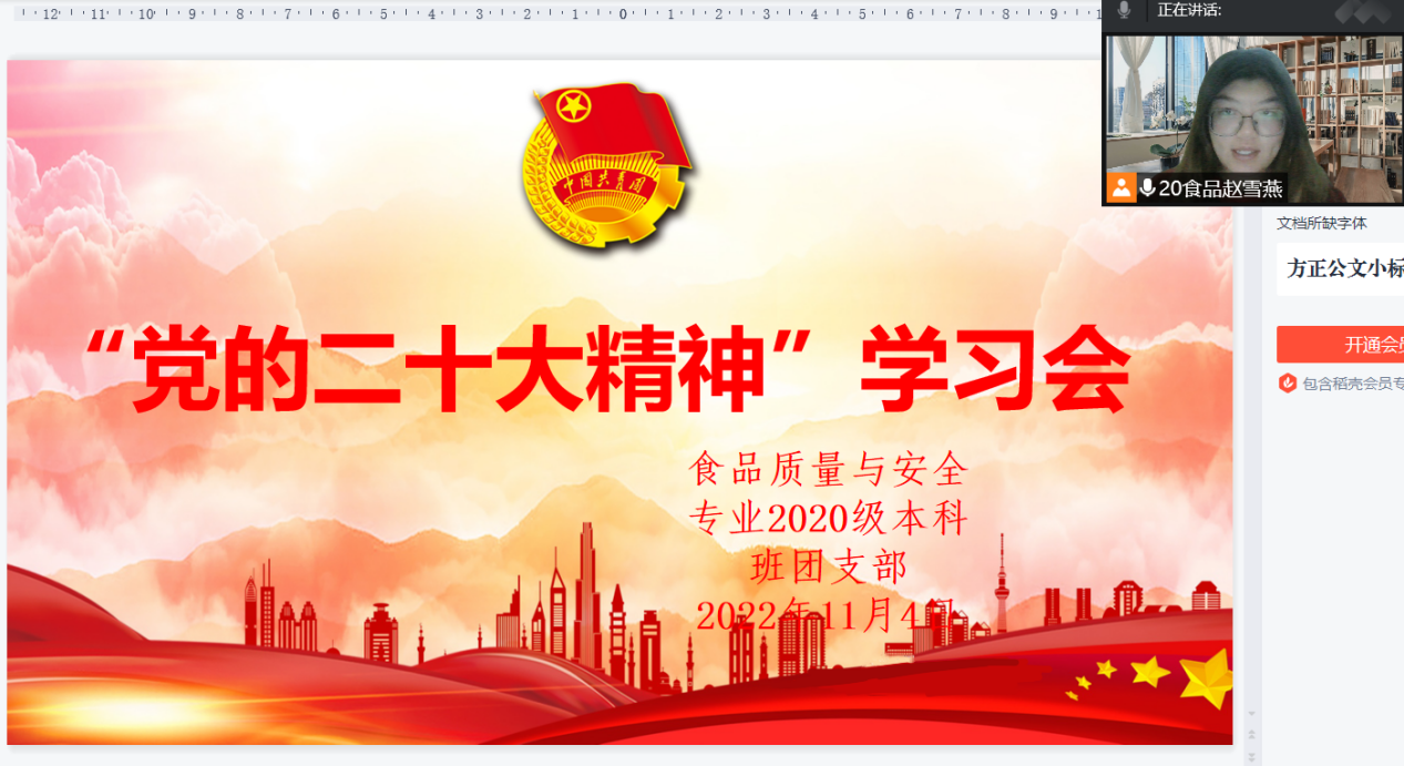 为贯彻落实习近平总书记在中国共产党第二十次全国代表大会上的重要讲话精神,精品视频8AV食品质量与安全专业2020级本科班团支部于2022年11月4日开展党的二十大精神学习会。