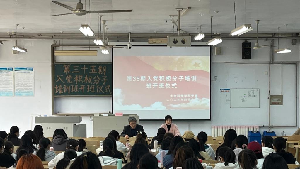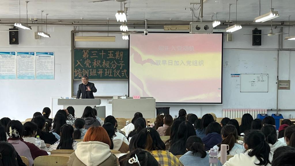 2023 年4 月11日,精品视频8AV党委于求实楼 0112 教室举行入党积极分子开班仪式。仪式由王琦老师主持,党委书记赵庆福同志为全体学员讲授第一堂党课。