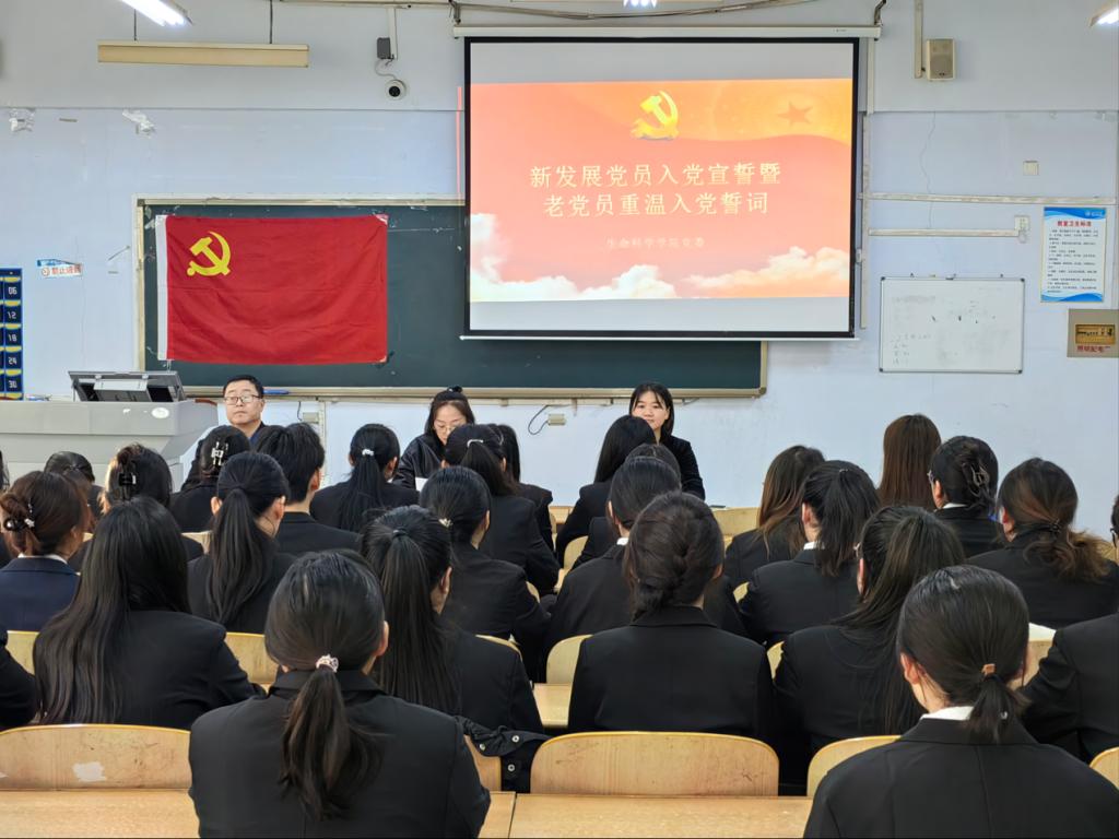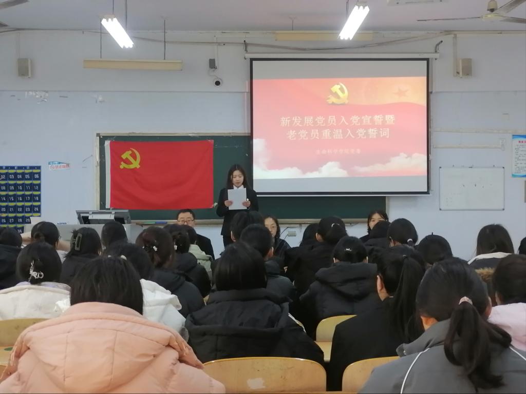 仪式在庄严的《国际歌》中正式开始,在鲜艳的党旗下,党员们高举右拳,庄严宣誓。铿锵有力的誓言在会场内回荡,展现了新老党员们对党的忠诚和为党的事业奋斗终身的决心。郭晶晶同学作为新发展党员代表发言,她表示作为党员要紧跟时代的步伐,与时俱进,努力学习党的理论知识,提高自己的思想认识,以榜样的姿态,努力学习科学文化知识,全心全意为人民,做一名名副其实的共产党员,为党和人民的事业做出更大贡献,为实现中华民族伟大复兴的中国梦努力奋斗。