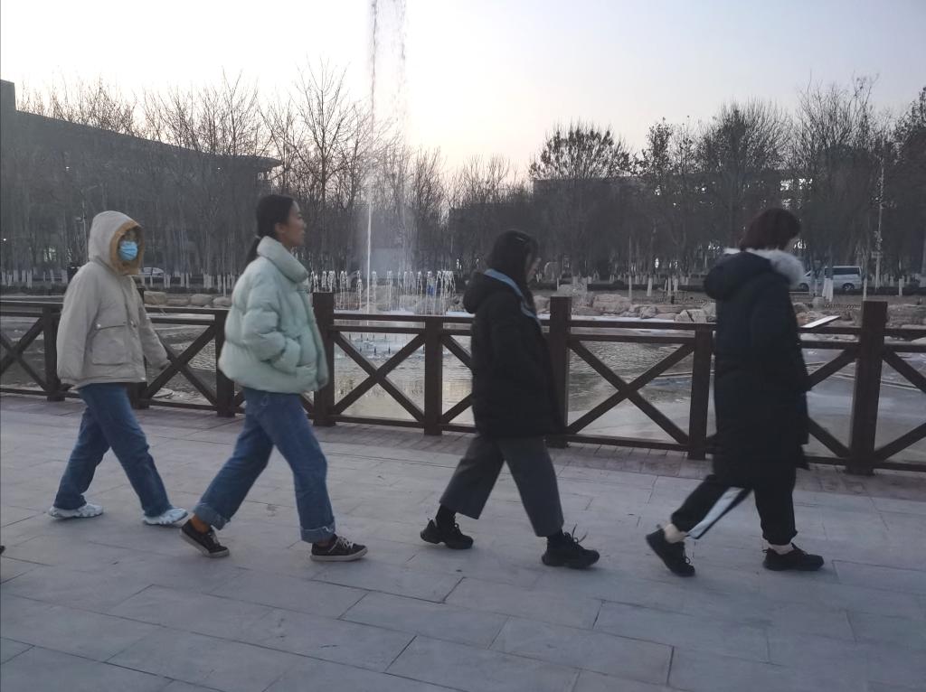 天蒙蒙亮,同学们便顶着寒风在广场内排成整齐的队伍,为接下来的活动做好充分的准备。在前期的“团队热身”活动阶段中,宫铭同学带领大家做了扩胸、体转、振臂、弓步和侧步压腿运动,他的动作十分有力、规范。在接下来的“漫步校园”活动阶段中,同学们排成整齐的一队,在广场喷泉的外围道路上慢慢的行走,他们伸展双臂、疏络筋骨,欣赏着喷泉与路边的树木,身心愉悦。在“绽放青春”活动阶段中,同学们在广场上自由组队做着各种样式的健身操,进一步的舒展自己的身体,使自己的身心得到了放松。活动结束后,同学们纷纷表示,此次活动给他们提供了锻炼的机会,使他们的身心得到了放松,让他们有更充沛的精力投入到紧张的期末复习当中,为取得一个好成绩而努力。