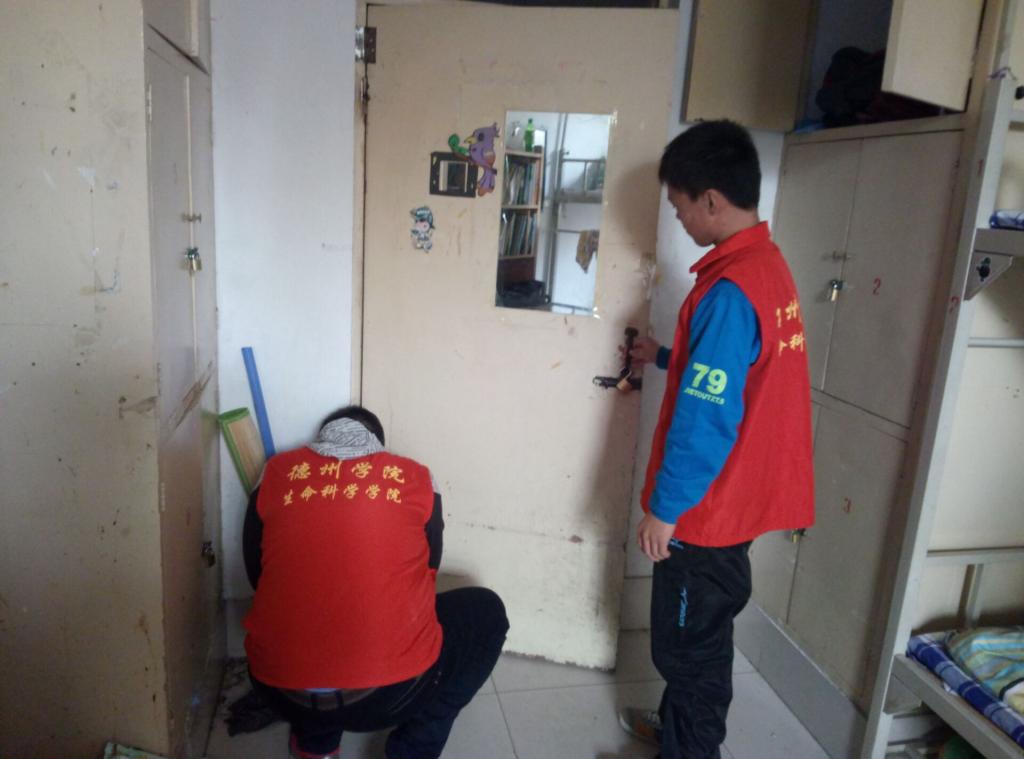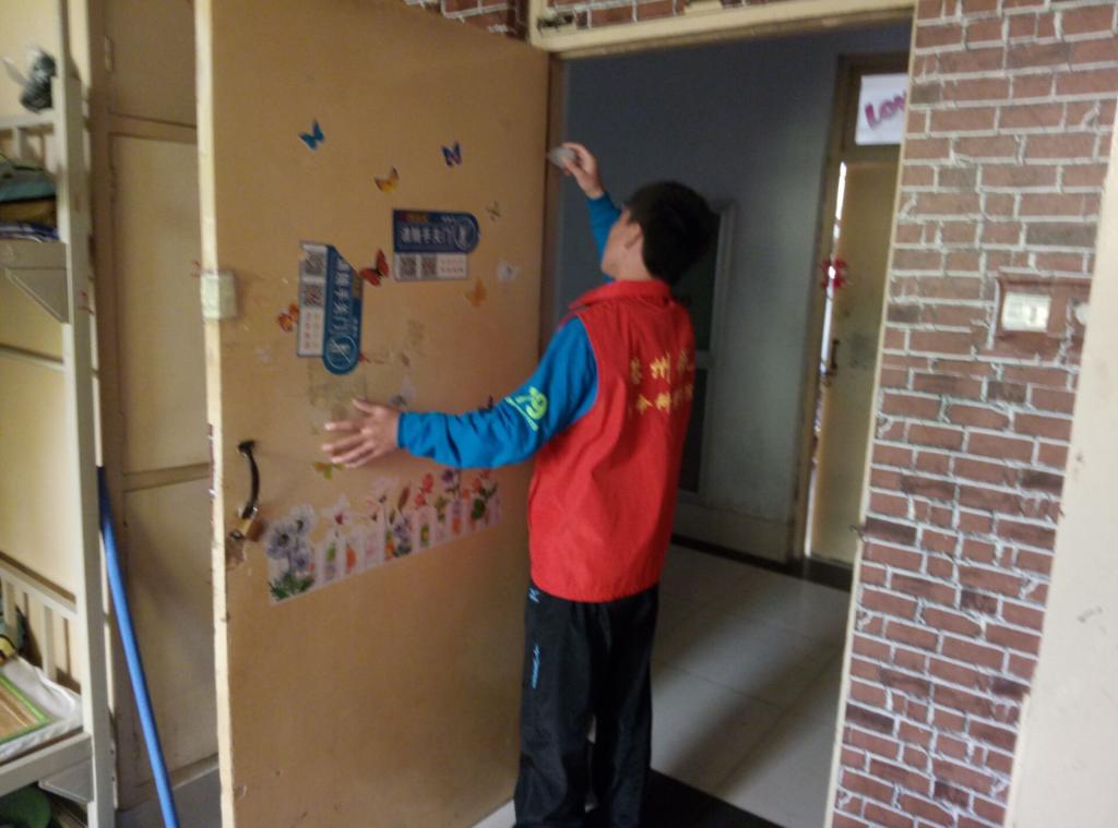 活动中,志愿者为各个宿舍的门轴涂上润滑油,以防止门会长锈,造成不便,并向各个宿舍的同学们宣传如何爱护门。