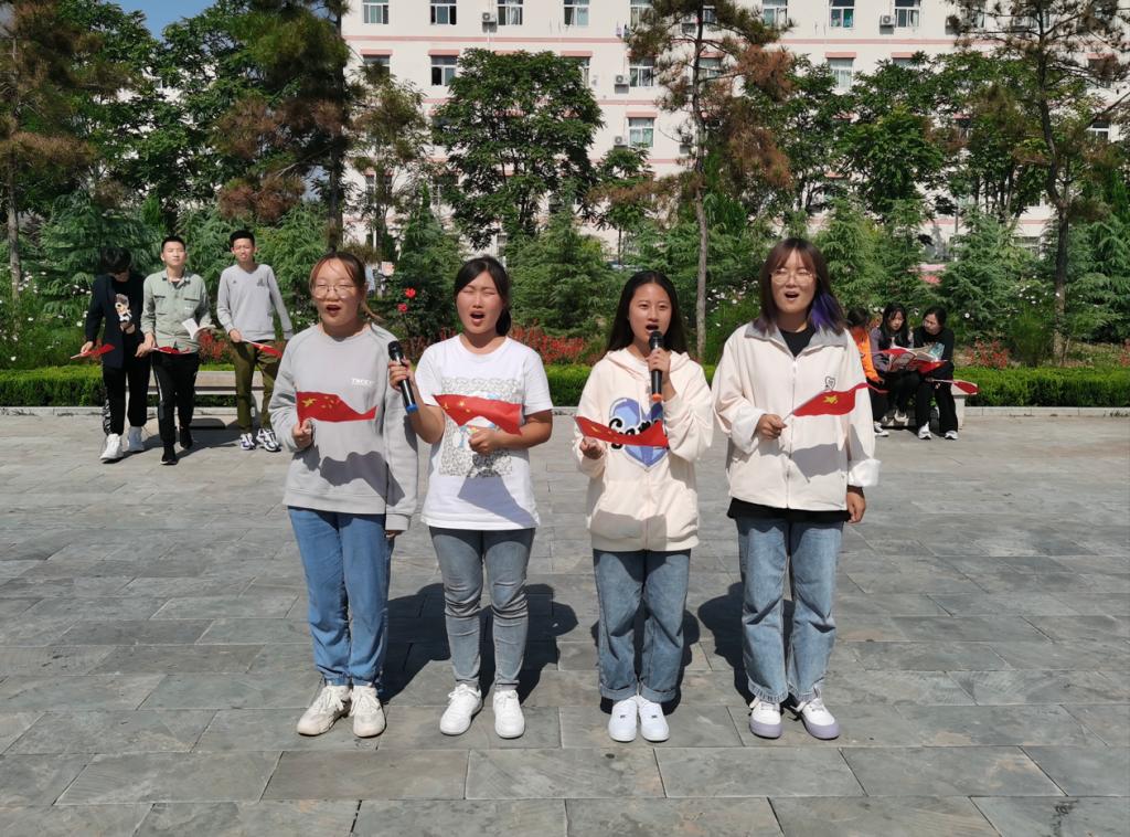 同学们聚在一起,用快闪的形式,共同唱响《我和我的祖国》,他们热情饱满、斗志昂扬,挥舞着五星红旗,配和着优美的旋律,歌声分外嘹亮。一首红歌就是一段岁月,慷慨激昂的歌声表达着莘莘学子的豪情,也燃起了他们心中的爱国情怀,经典的红歌唱出了对祖国的热爱与忠诚,使同学们铭记祖国的峥嵘岁月与辉煌成就,展现了他们奋发向上的精神风貌。