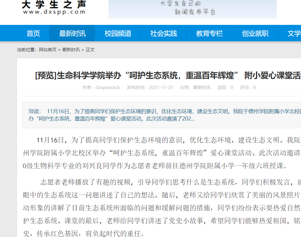 11月16日,为了提高同学们保护生态环境的意识,优化生态环境、建设生态文明。我院于德州学院附属小学北校区举办“呵护生态系统,重温百年辉煌”爱心课堂活动。此次活动邀请了2020级生物科学专业的刘兴良同学作为志愿者老师前往德州学院附属小学一年级六班授课。