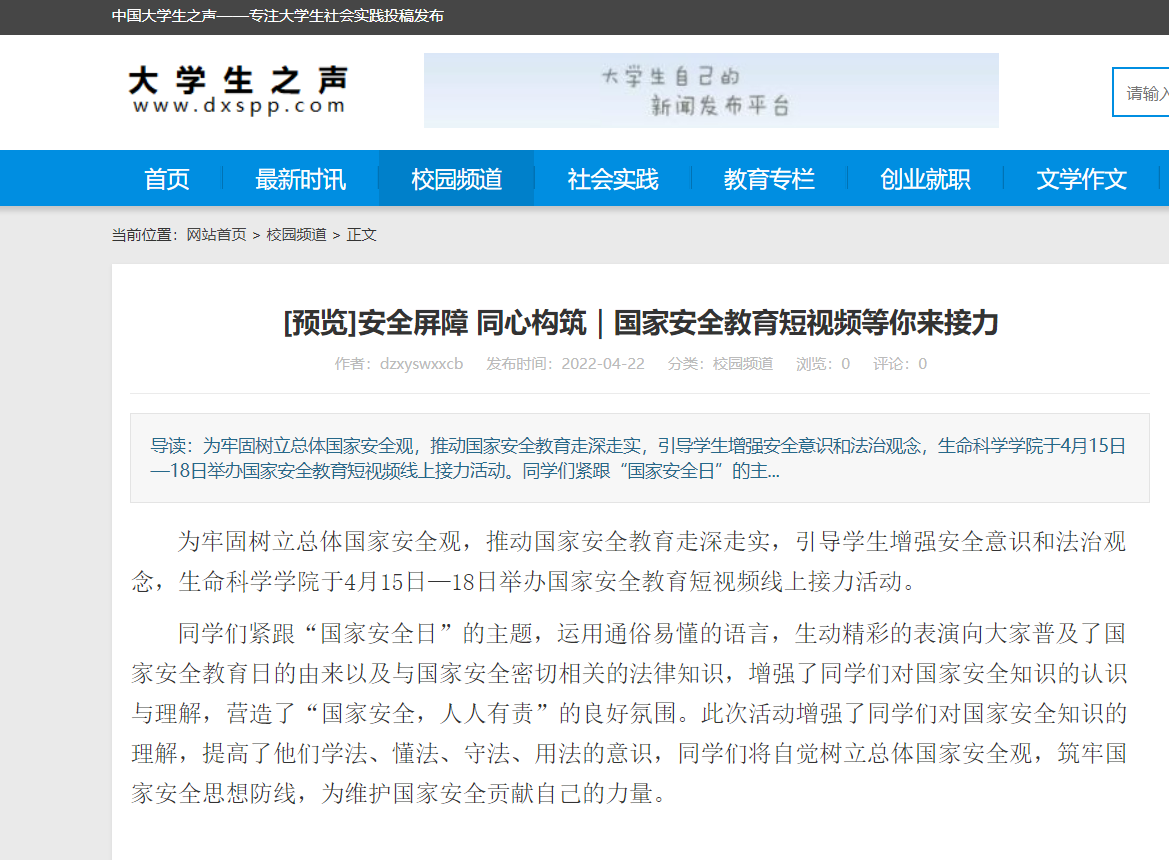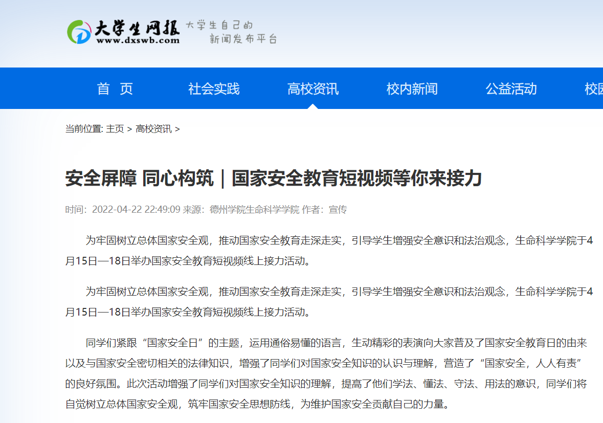 为牢固树立总体国家安全观,推动国家安全教育走深走实,引导学生增强安全意识和法治观念,精品视频8AV于4月15日—18日举办国家安全教育短视频线上接力活动。