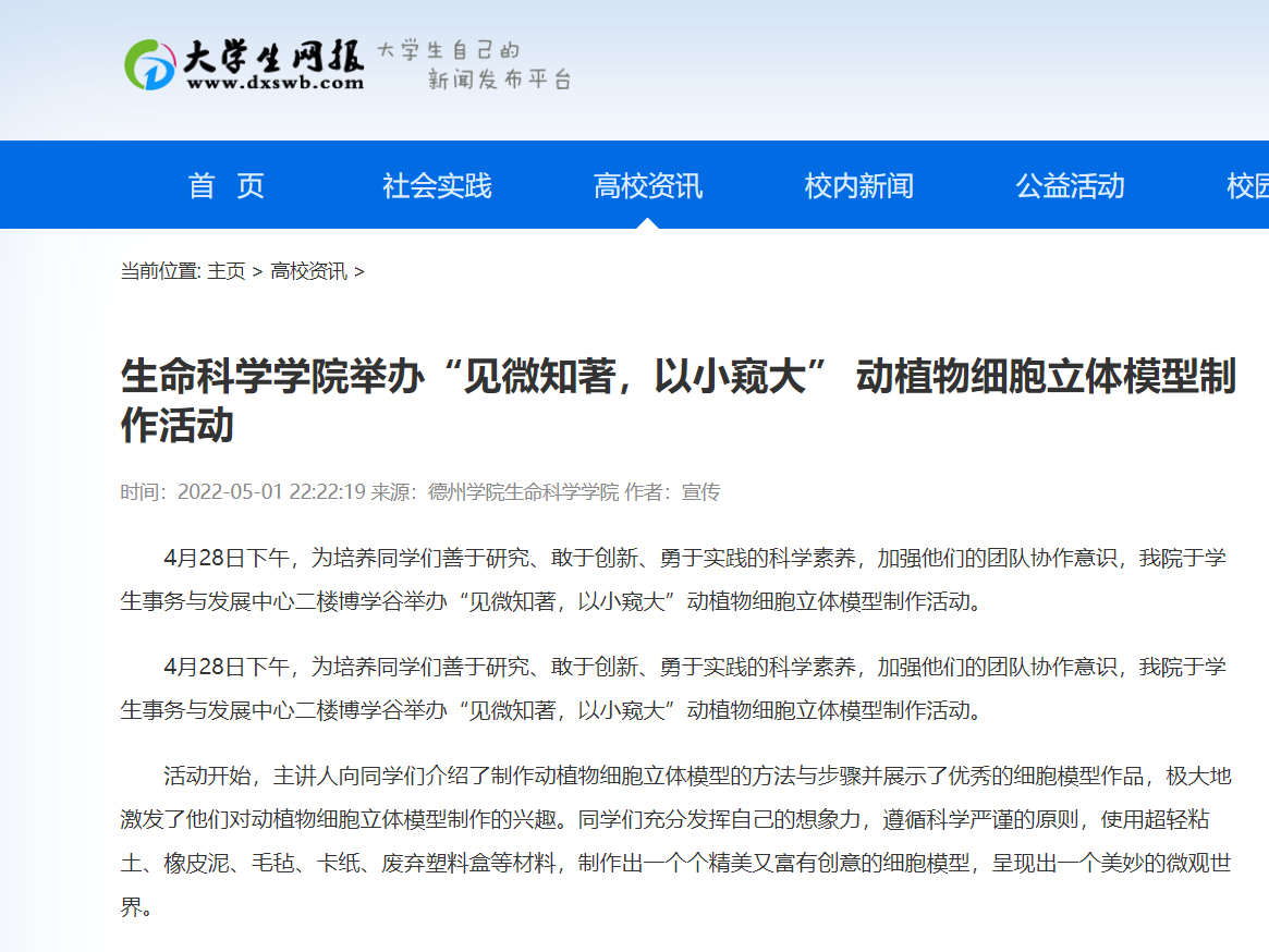 4月28日下午,为培养同学们善于研究、敢于创新、勇于实践的科学素养,加强他们的团队协作意识,我院于学生事务与发展中心二楼博学谷举办“见微知著,以小窥大”动植物细胞立体模型制作活动。