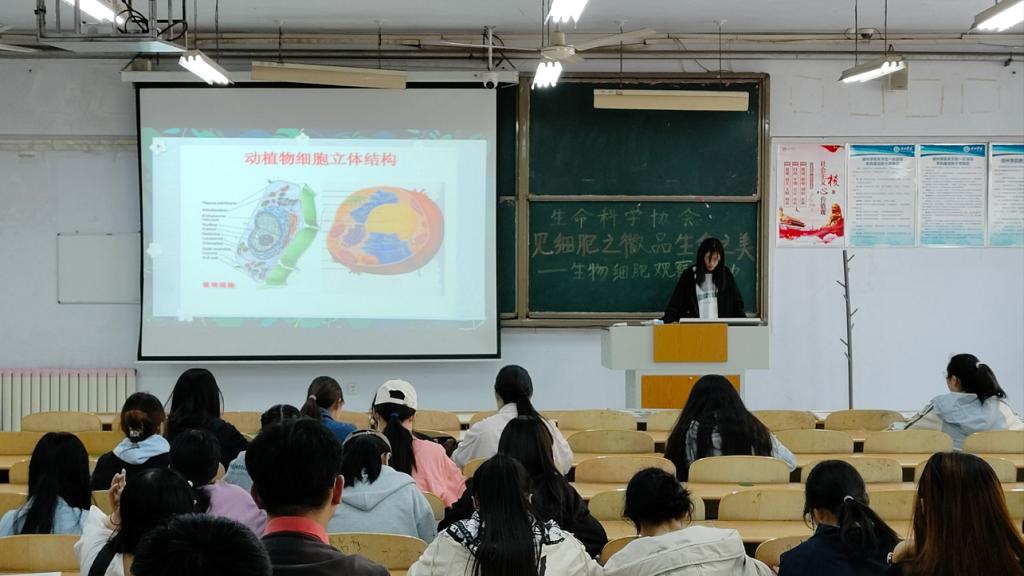 活动现场,主讲人详细讲解了细胞在自然界的地位及意义,播放了动植物细胞生活方式的视频,使大家直观地感受到微观生物世界。随后,主讲人用生动的语言向同学们讲解了植物细胞和动物细胞的结构与功能,引导同学们从细胞的角度观察世界,发现生命在微观角度下的魅力。最后,主讲人向同学们展示了常见的植物标本,使同学们近距离观察其形态,引发他们对生命的感悟与思考。