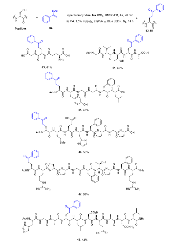 此方法能应用于非天然氨基酸的合成以及长肽的直接修饰。无论半胱氨酸在多肽的N端、C端或者中间,均能实现半胱氨酸的位点选择性修饰。LADA策略具有明显的优点,如良好的官能团耐受性、宽广的底物适用范围、合成操作简便。此外,修饰的非天然氨基酸产物的立体构型不受影响,该策略有望应用于多肽药物的开发以及蛋白质的功能化修饰。