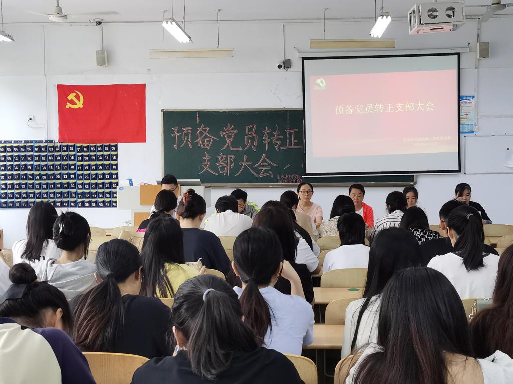 6月15日下午,精品视频8AV第二学生党支部在求实楼0107教室召开预备党员转正支部大会,会议严格按照发展党员工作实施细则执行,出席本次会议的有精品视频8AV党总支副书记夏书珍、第二学生党支部全体党员和培养联系人老师。