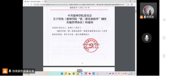 会上,各团支部书记带领团员们认真学习领会了《共青团中央召开电视电话会议学习贯彻习近平总书记重要讲话精神》和《习近平主持召开深入推动黄河流域生态保护和高质量发展座谈会并发表重要讲话》,深刻感悟党对青年学生寄予的厚望和时代赋予的光荣使命。随后,团员们分享了疫情防控期间的感人故事,师生志愿者们挺身而出,维护好核酸检测的队伍秩序,督促好学生及时填写出入申请表,用实际行动做好疫情防控的守门员、引导员、服务员,为疫情防控保驾护航。除此之外,2021级各团支部还学习了《德州学院“第二课堂成绩单”制度实施管理办法》、《德州学院第二课堂课程开设办法》,帮助大家进一步了解第二课堂相关内容,围绕全校师生共同抗击疫情的生动实践,上好疫情防控思政课,以实际行动迎接党的二十大胜利召开。
