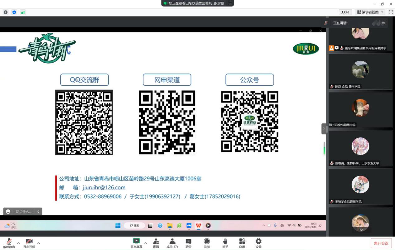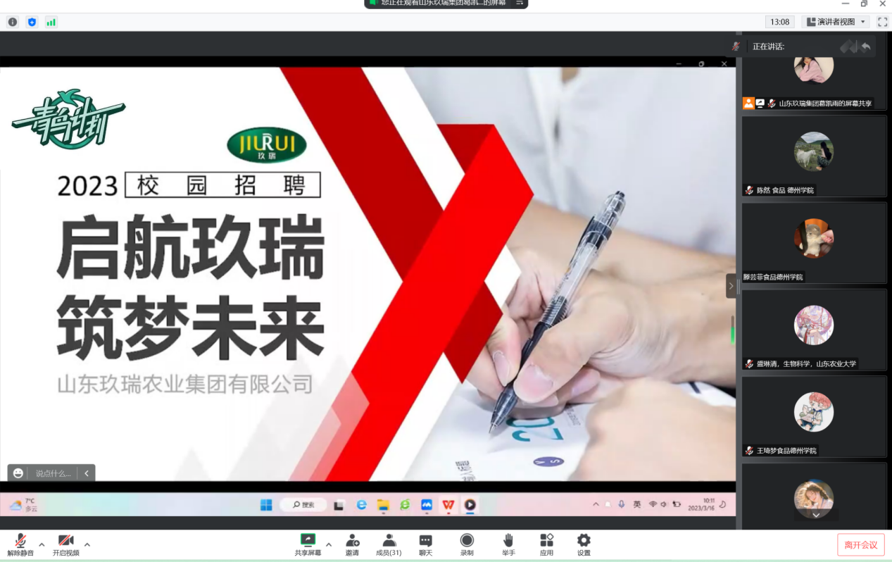 2023年3月16日,为贯彻落实2023届毕业生的创业就业工作,进一步了解就业信息,精品视频8AV通过腾讯会议组织毕业生参加山东玖瑞农业集团有限公司线上招聘宣讲会。